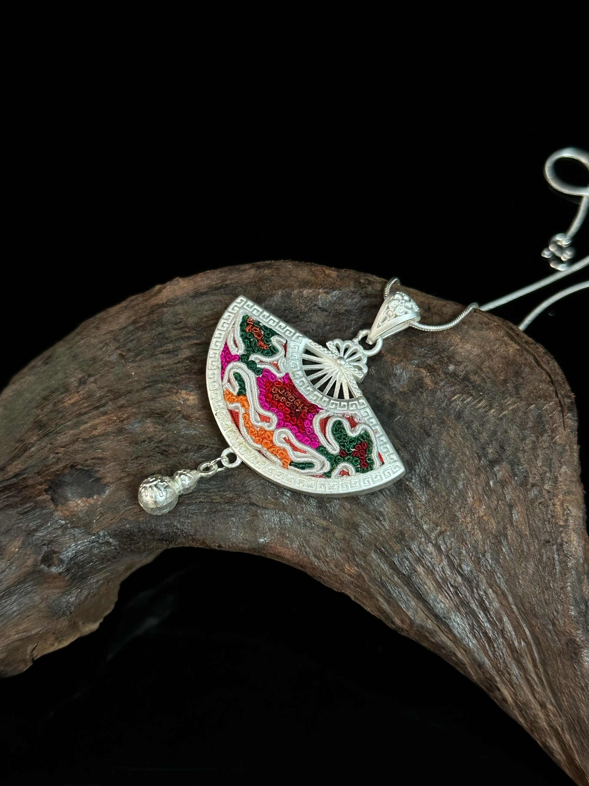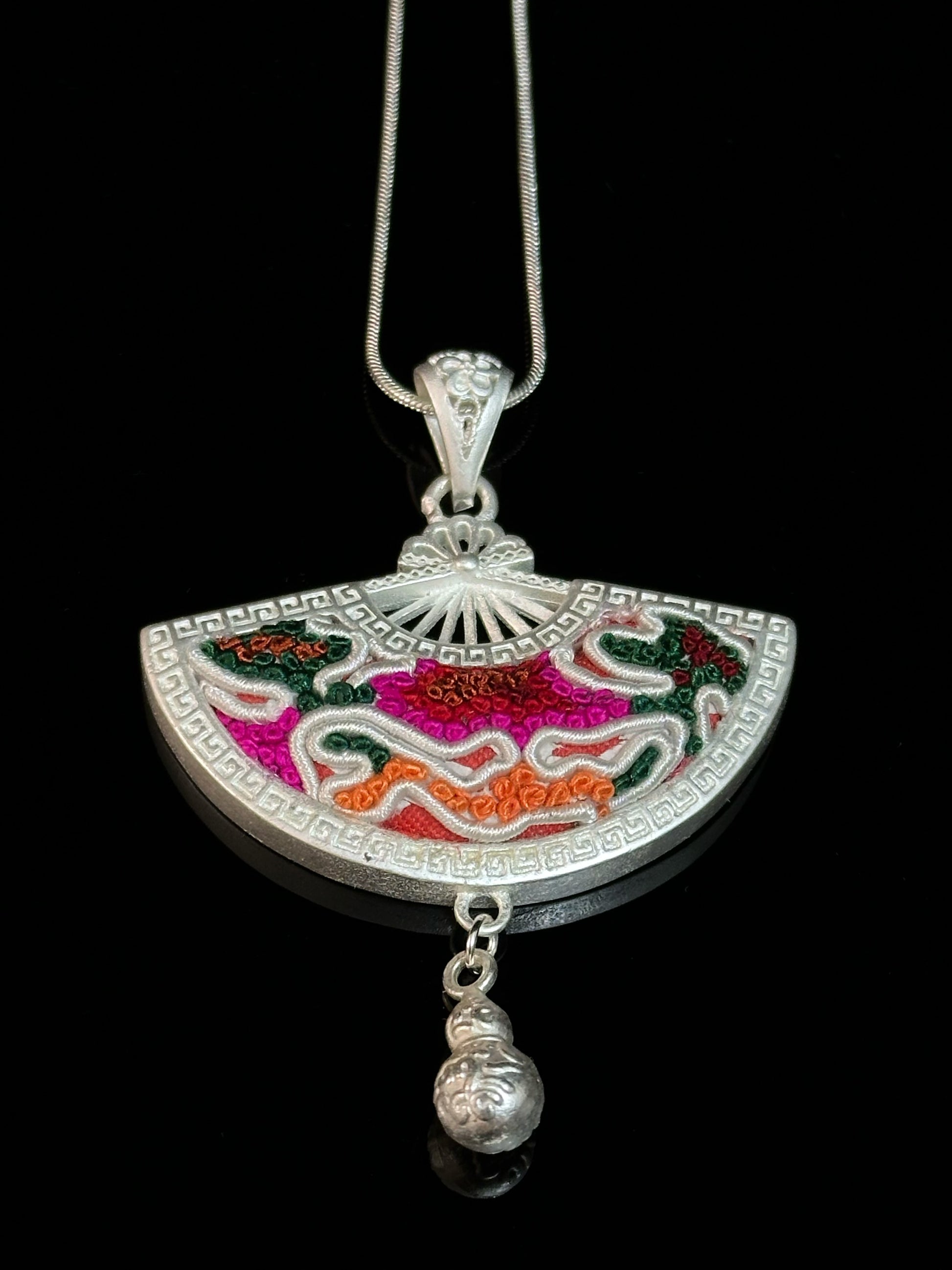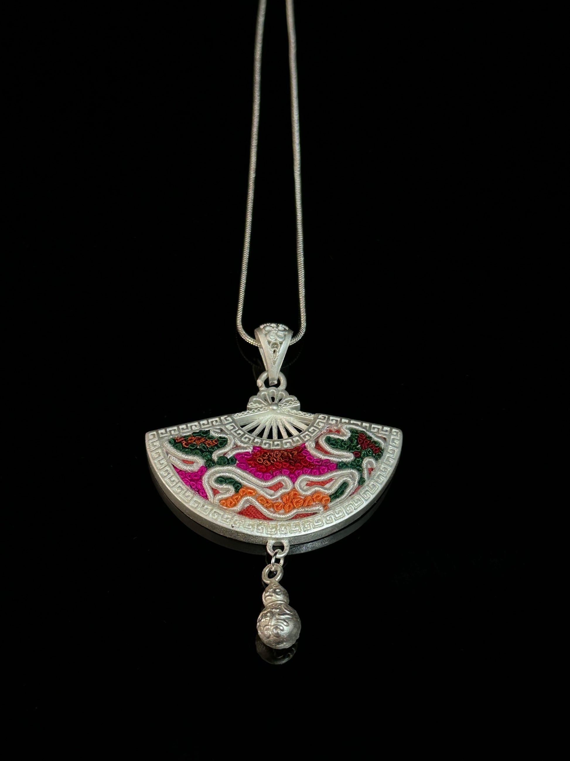 Aurorastream Melody captures a moment of movement—colorful Miao embroidery sweeps across a silver fan-shaped frame in bright, fluid lines. Each thread, stitched by hand, carries a story of joy and ritual from the highland villages. At the base, a single silver gourd charm sways freely. Turn the pendant over to reveal fine etchings of traditional blessing script—symbols of prosperity and peace meant to protect the wearer in daily life.