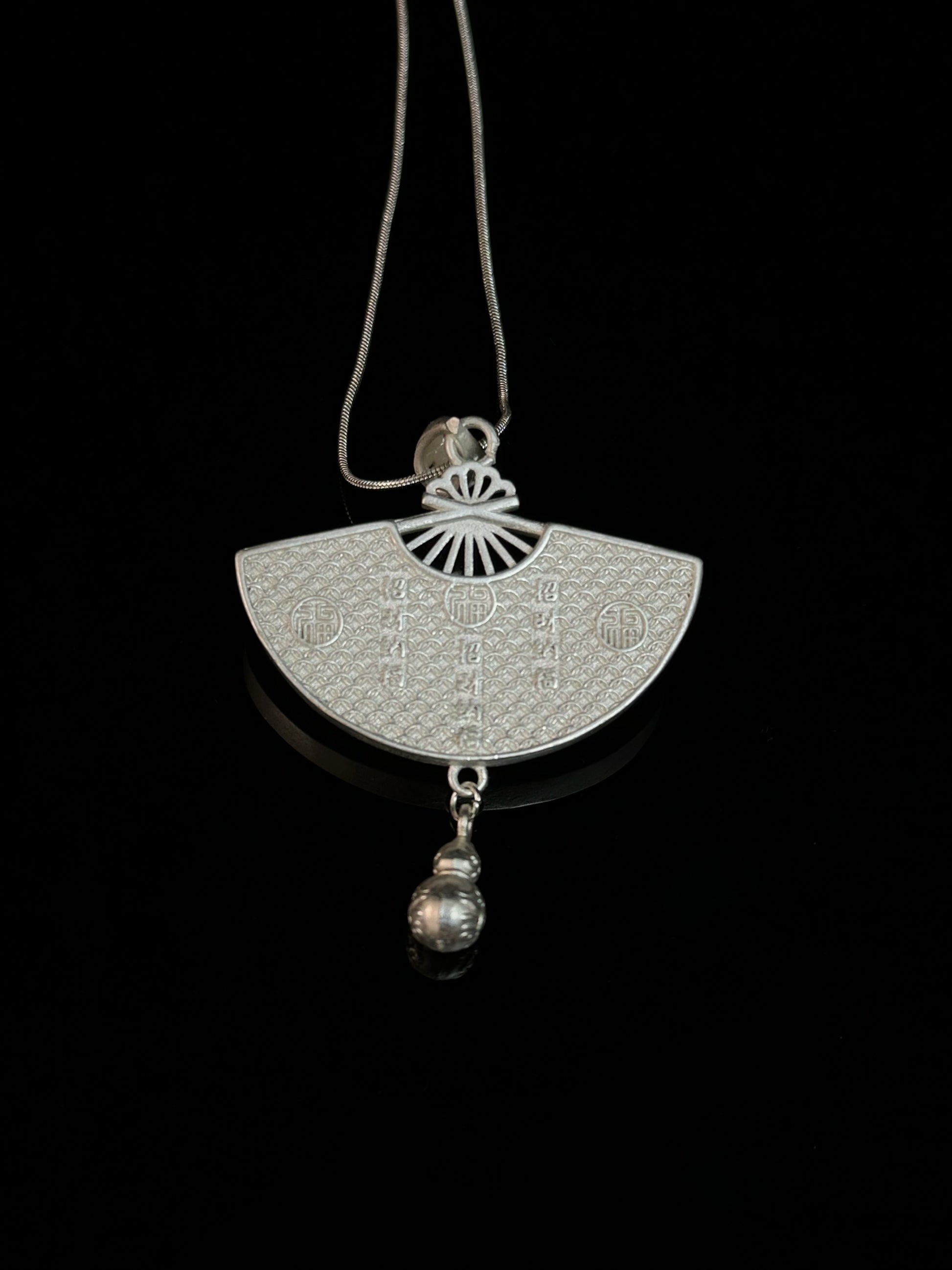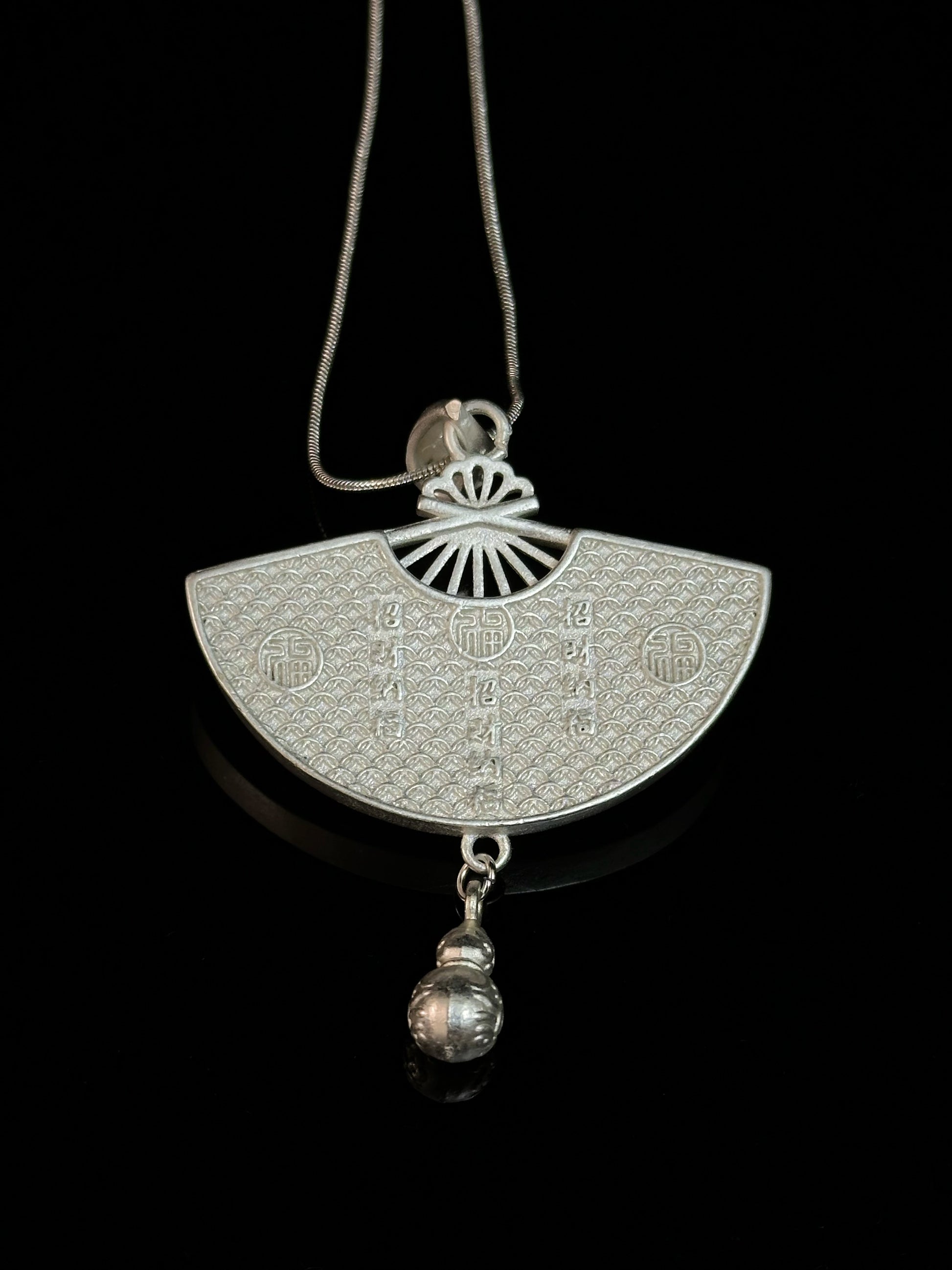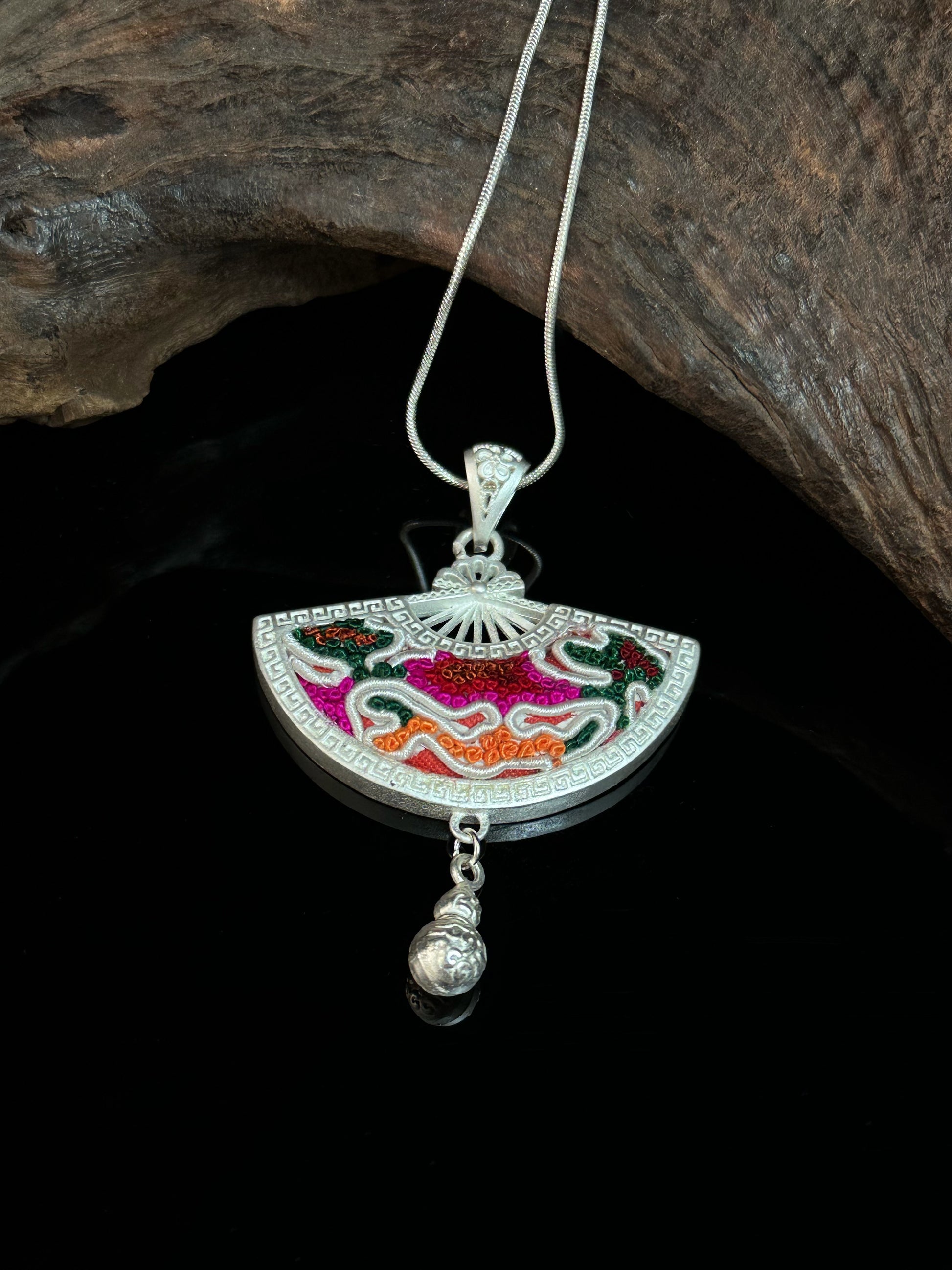 Aurorastream Melody captures a moment of movement—colorful Miao embroidery sweeps across a silver fan-shaped frame in bright, fluid lines. Each thread, stitched by hand, carries a story of joy and ritual from the highland villages. At the base, a single silver gourd charm sways freely. Turn the pendant over to reveal fine etchings of traditional blessing script—symbols of prosperity and peace meant to protect the wearer in daily life.