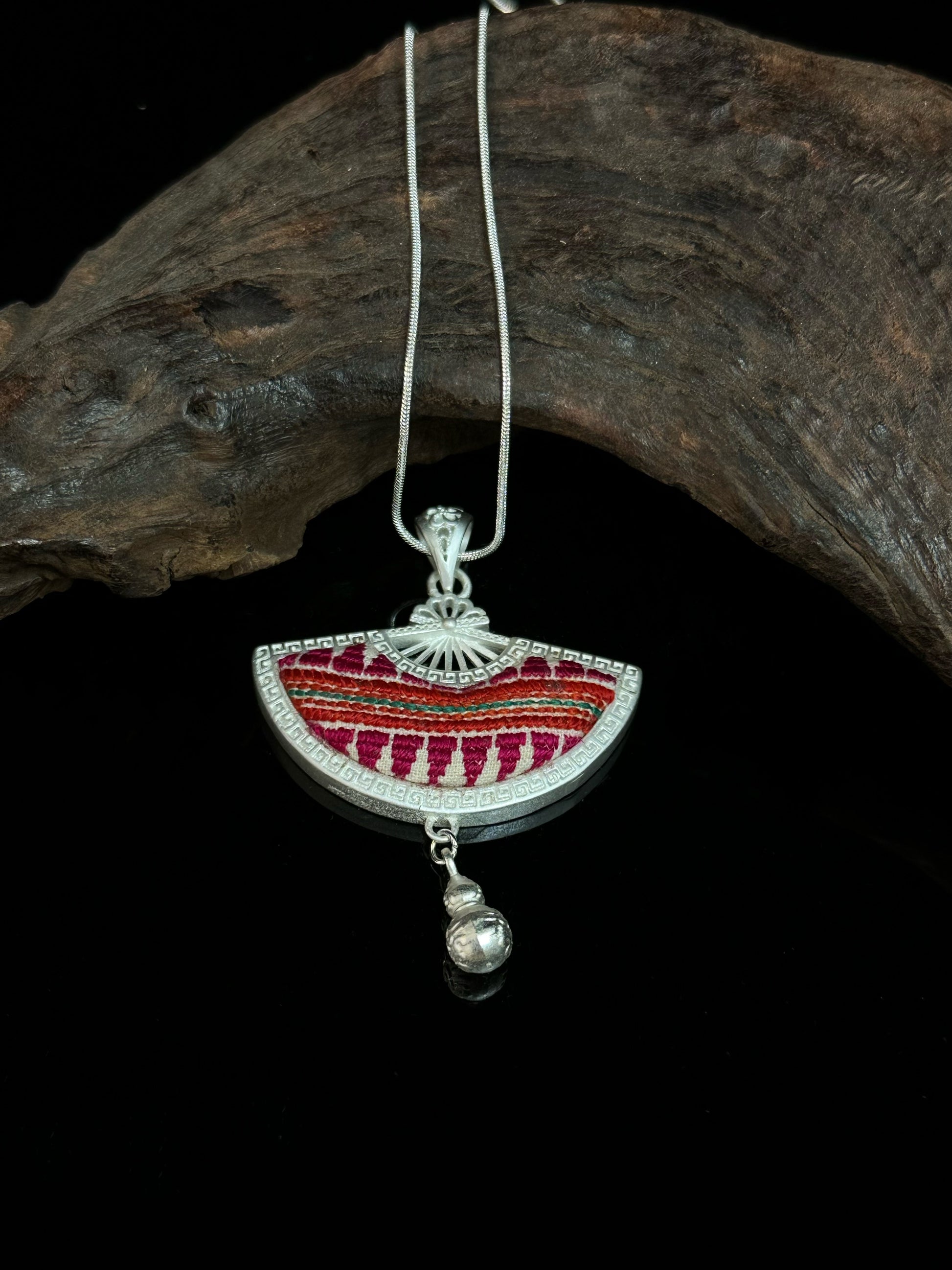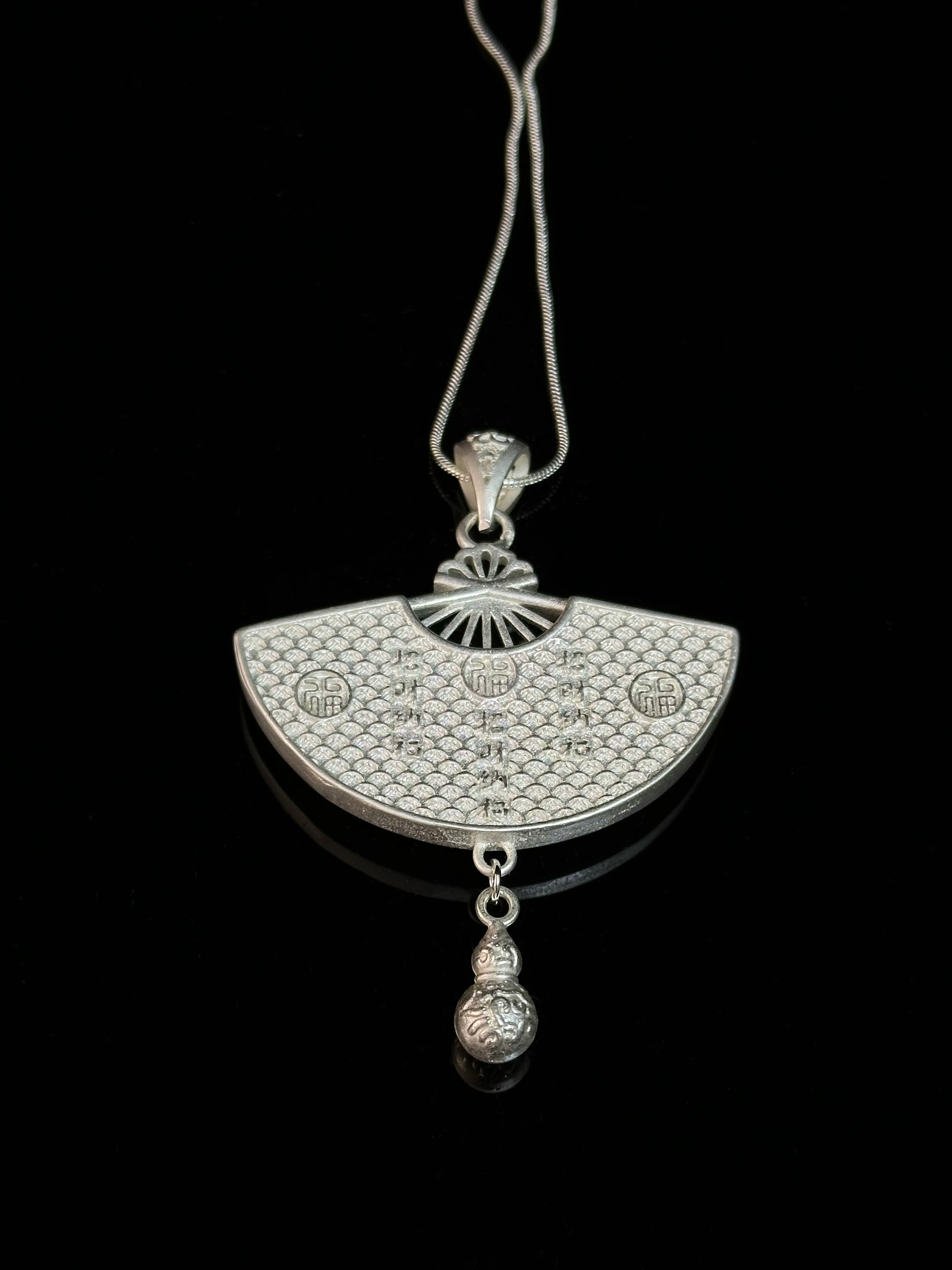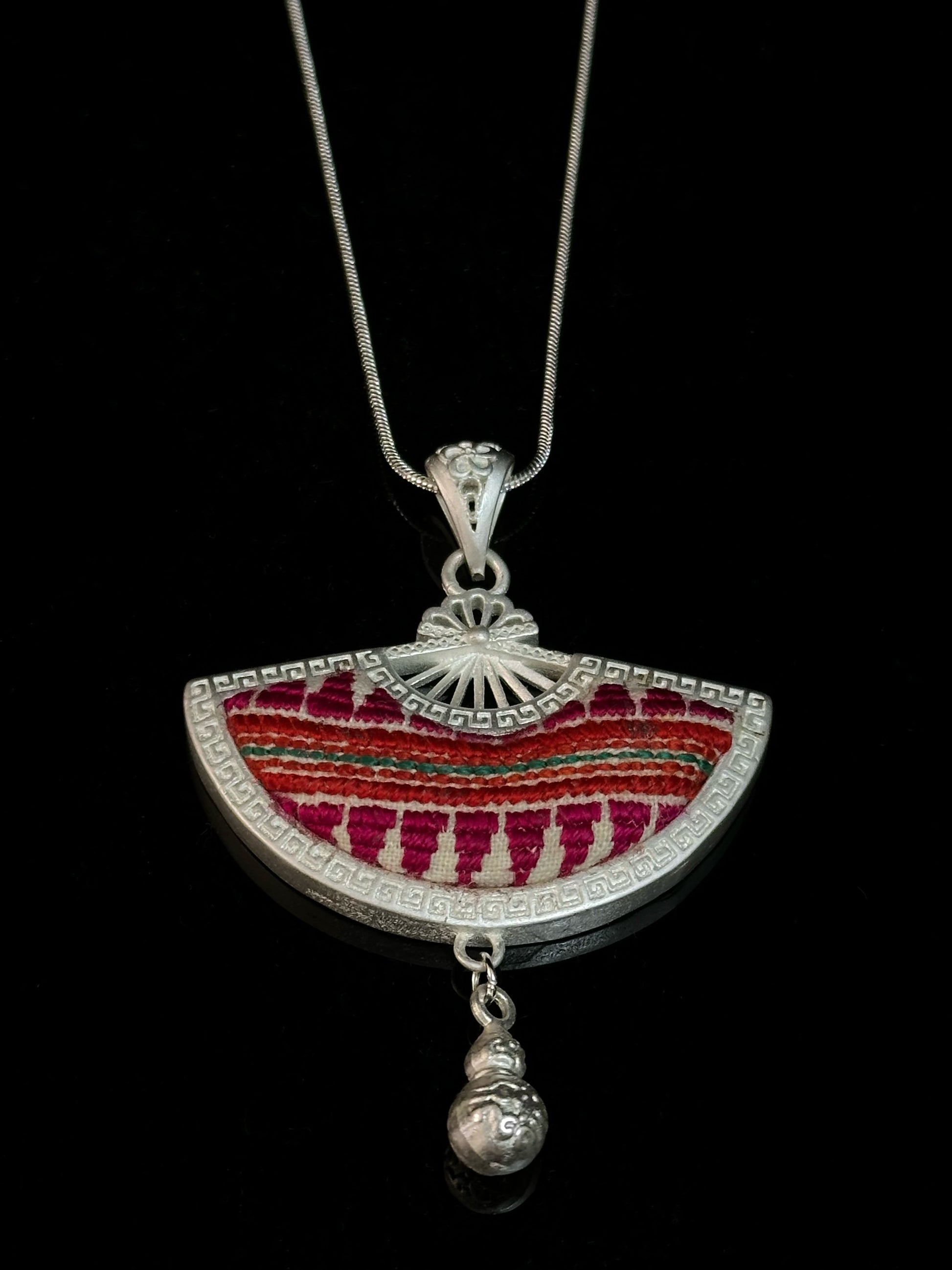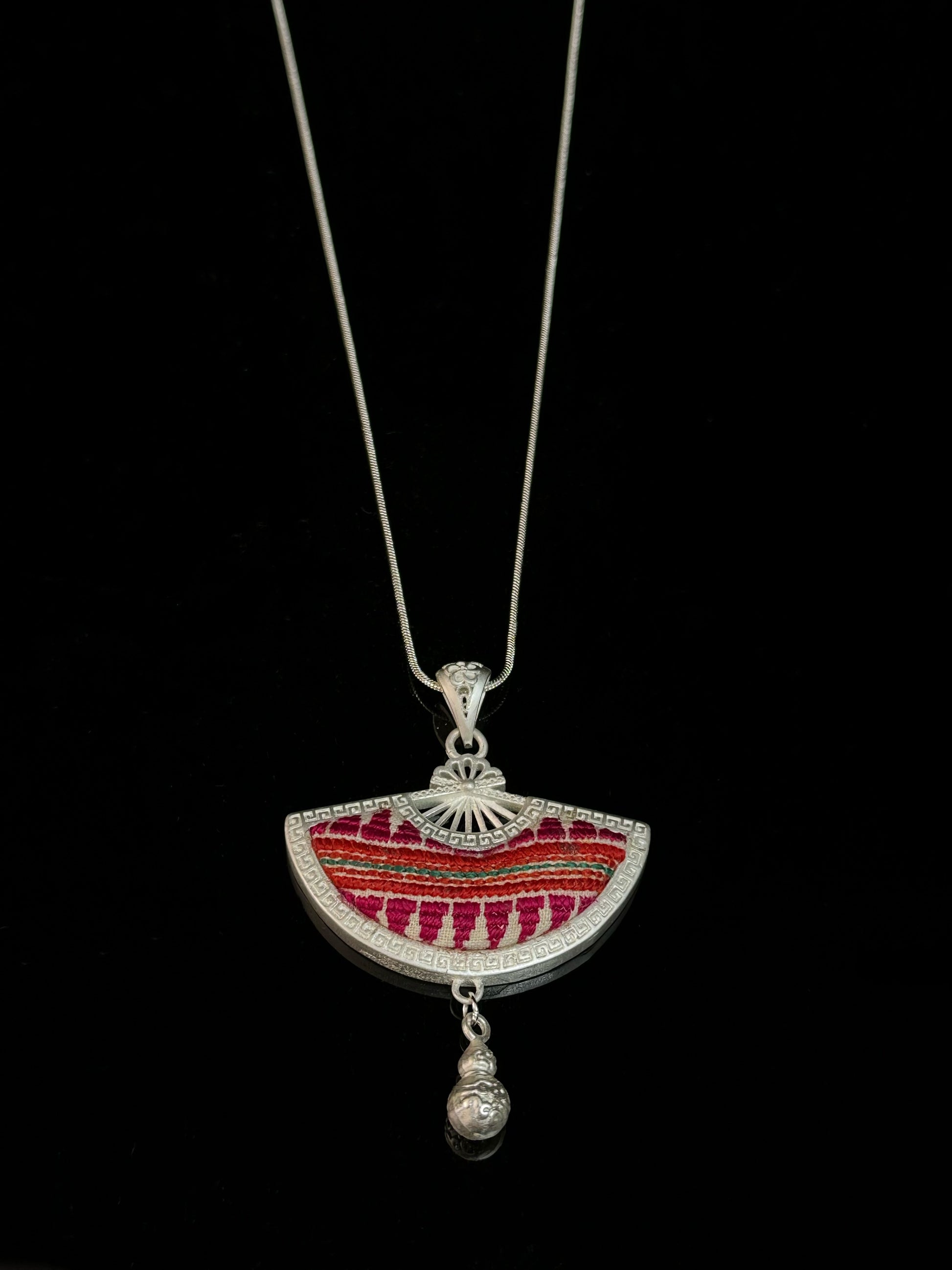 Crimsonwaves Echo from the Woven Sunmark is a statement of rhythm and heritage. Hand-embroidered by Miao artisans, its fan-shaped pendant captures waves of crimson threads woven over soft linen, framed in silver etched with the ancient sunmark pattern. A single gourd charm sways below—light-catching and talismanic. Turn the pendant over to find a field of embossed symbols, each echoing traditional blessings of longevity, protection, and renewal.