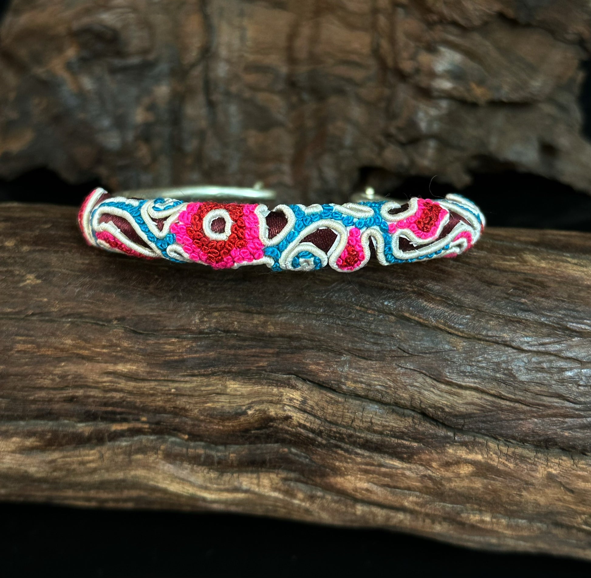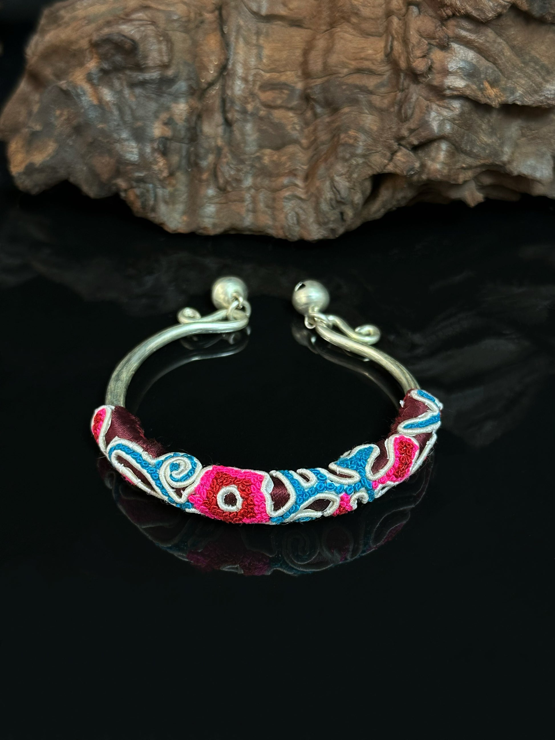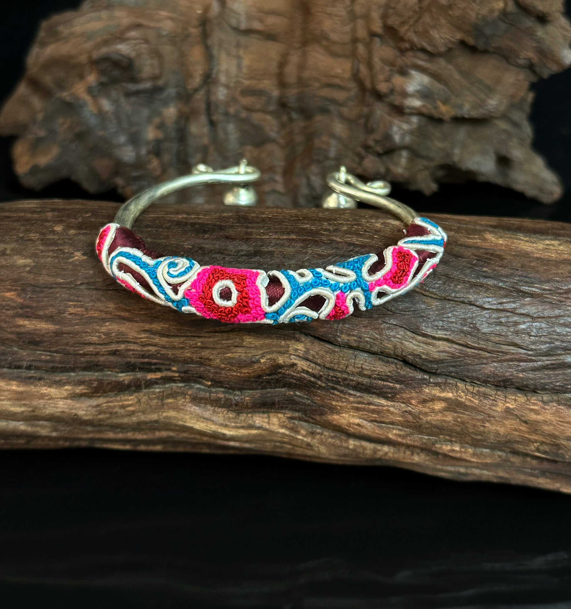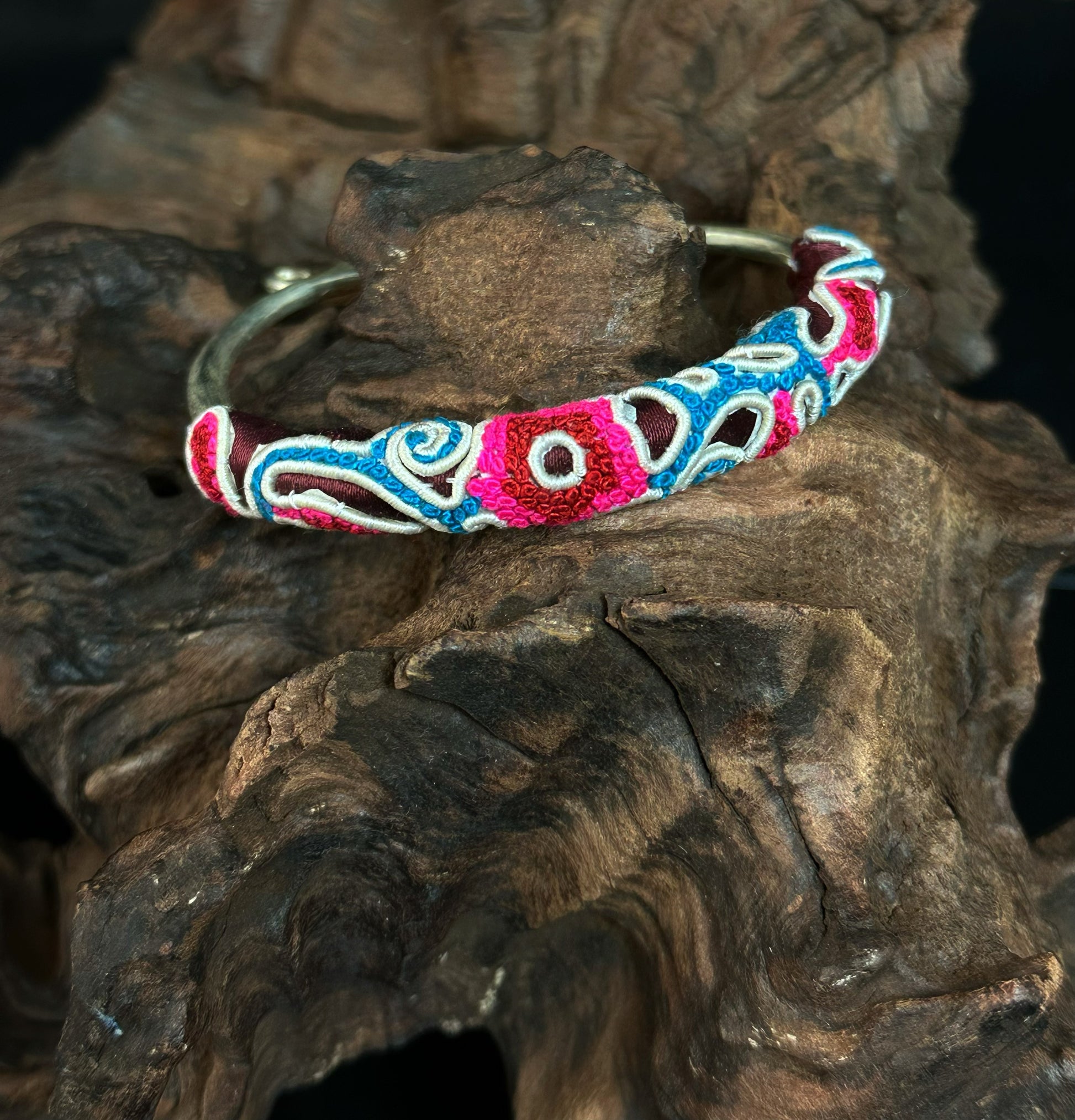 Cut from vintage Miao textile art, embroidered by elder artisans in the mountains of Southwest China, this bangle is more than jewelry — it is a handmade talisman believed to ward off misfortune and invite clarity, awareness, and good fortune.