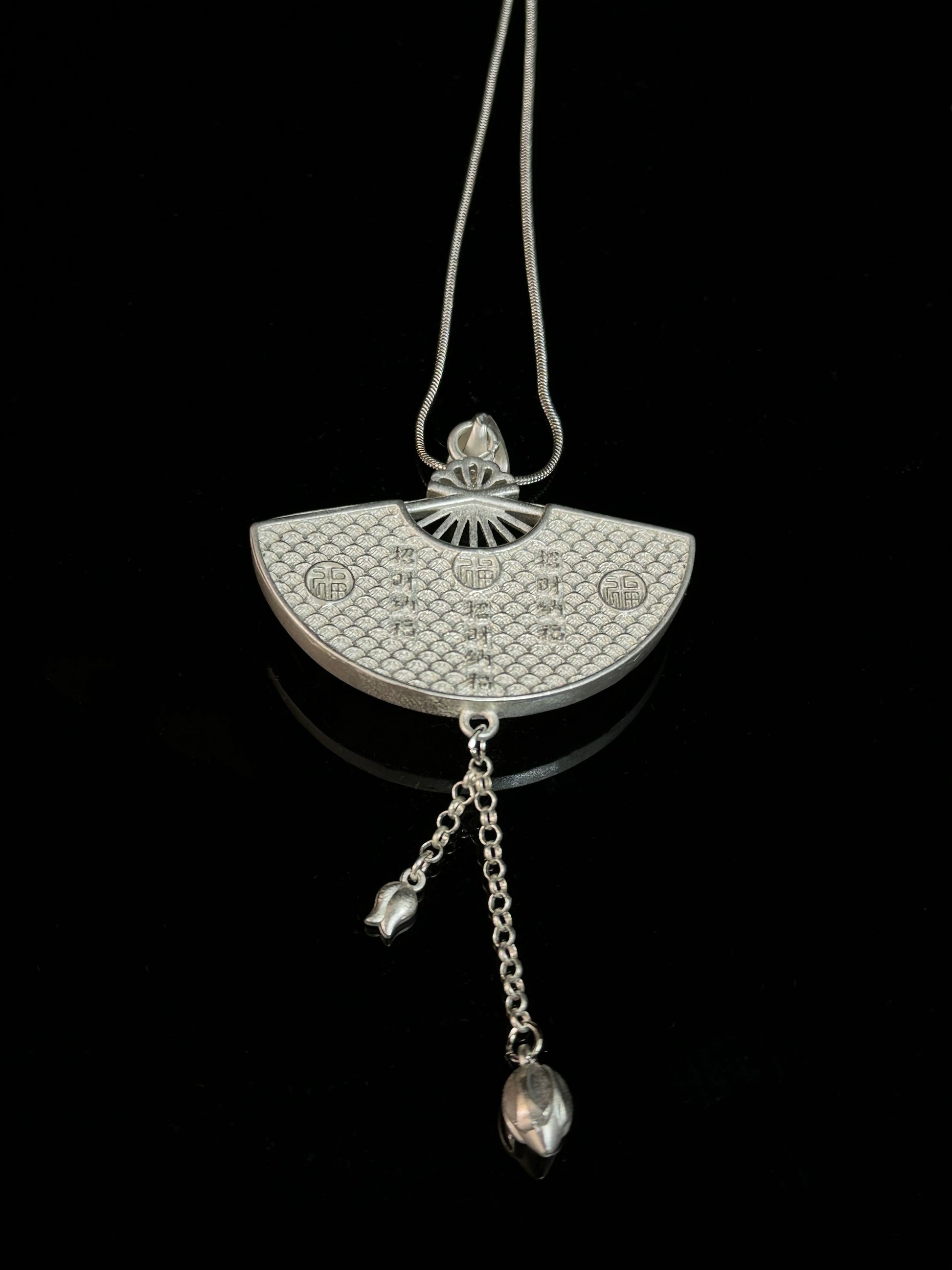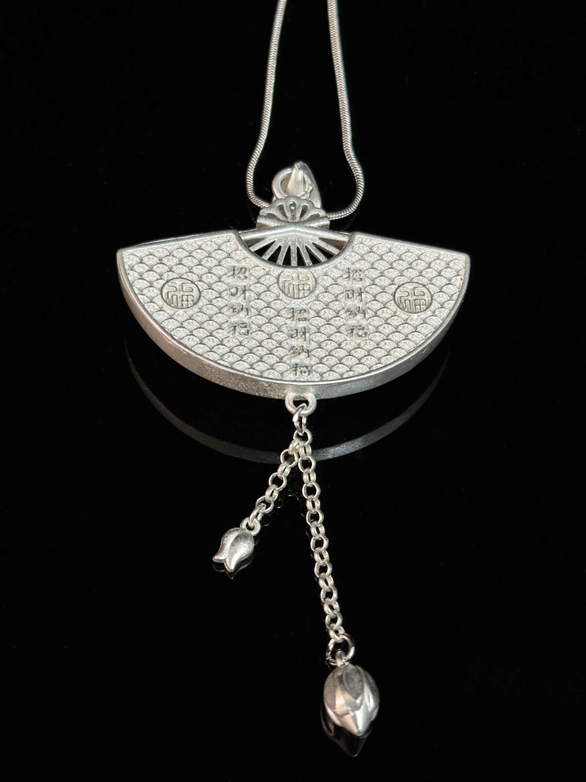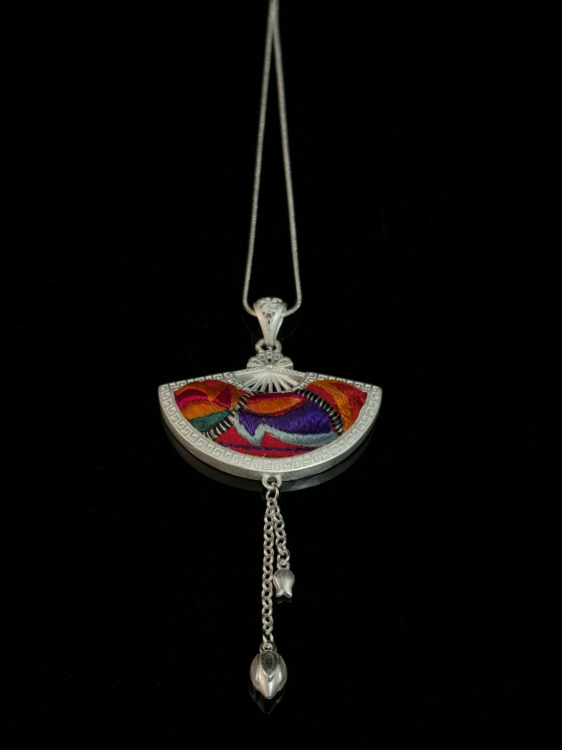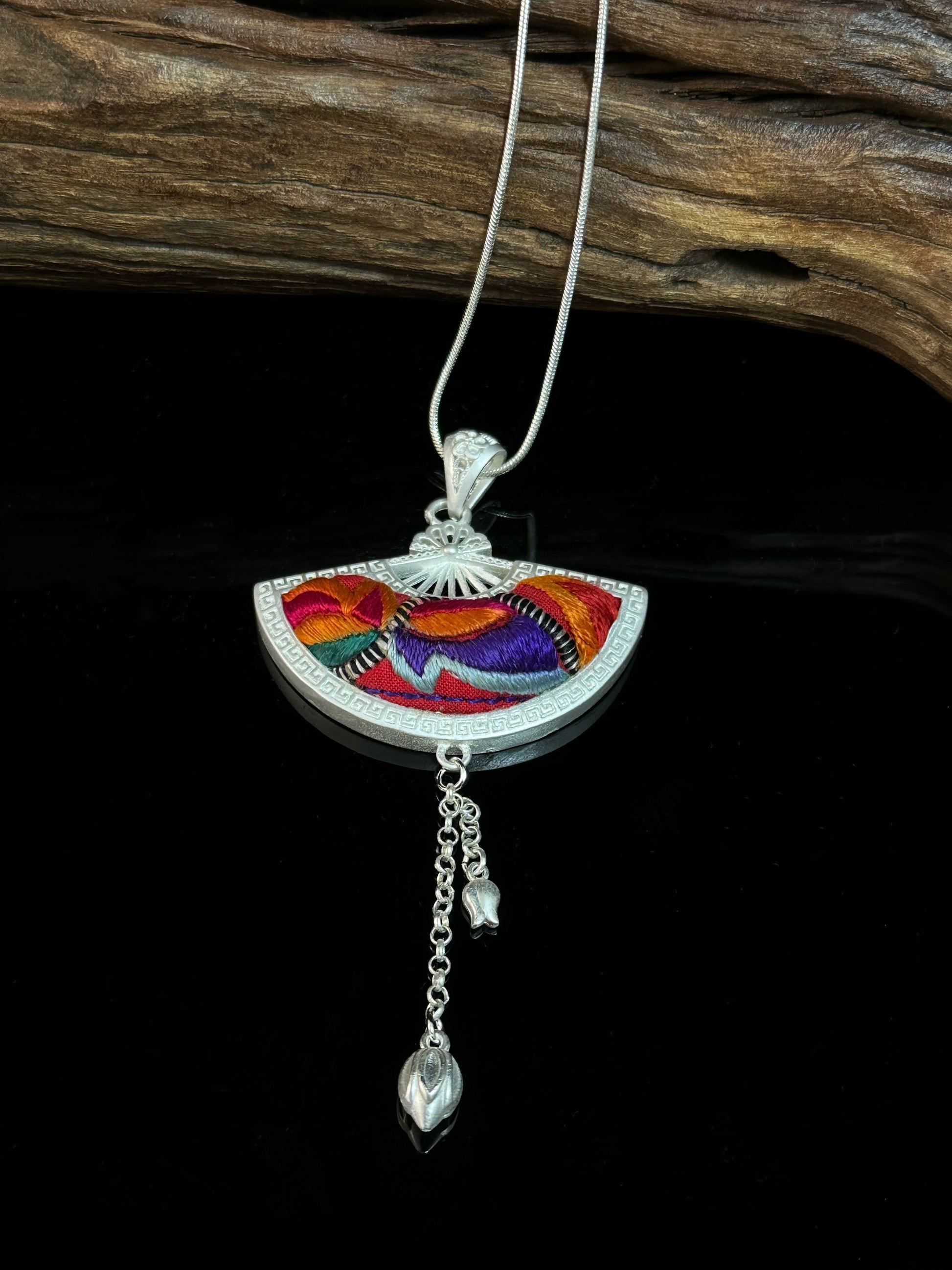 This pendant is stitched entirely by hand, with bold phoenix-toned embroidery in shades of crimson, orange, and violet. The silver fan frame is etched with a Miao motif of “blessing” on the reverse side, surrounded by traditional script symbols. A pair of silver charms dangle below, catching the light with each movement.