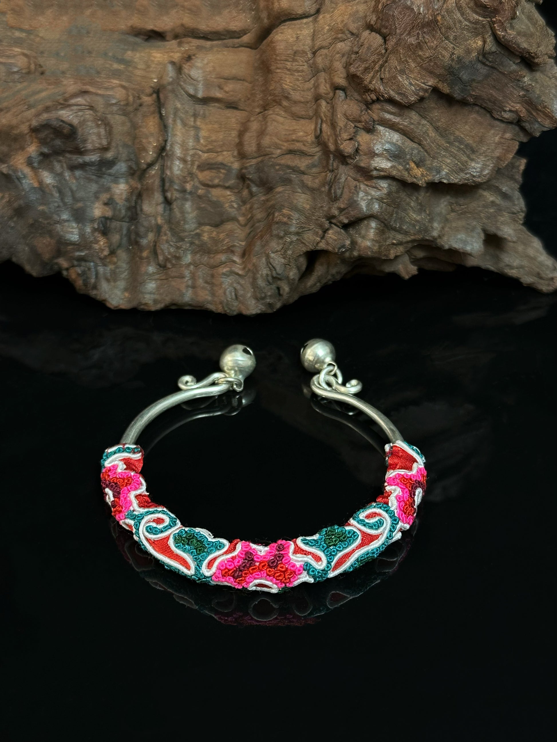 The embroidery featured on our bangles is meticulously cut from the hand-embroidered textile pieces shown in the images below. These intricate panels are crafted by elderly Miao artisans using the traditional knot embroidery technique, a highly detailed method that modern machinery cannot replicate. As a result, each bangle is entirely handmade — a genuine expression of cultural heritage and artisanal excellence.
