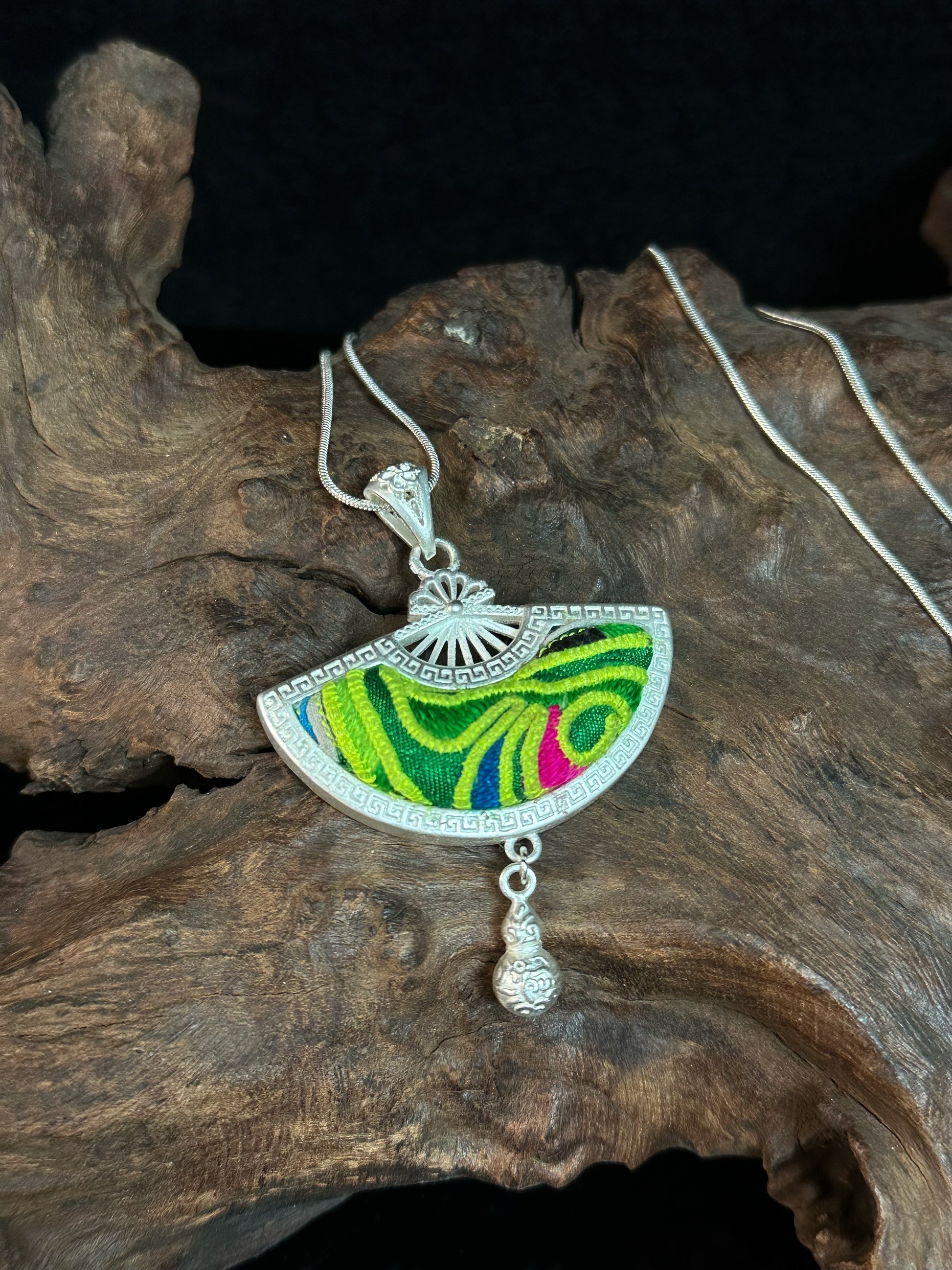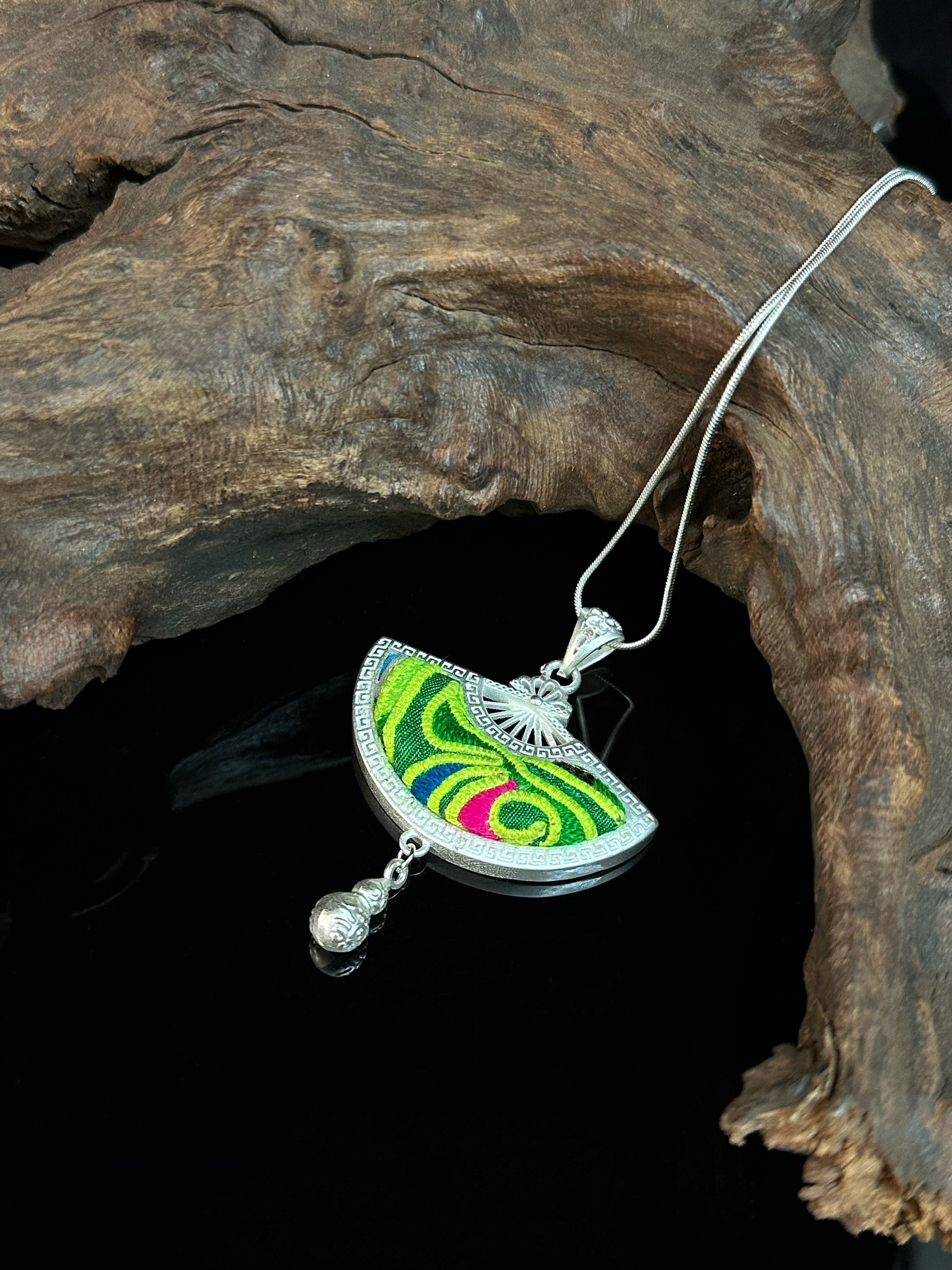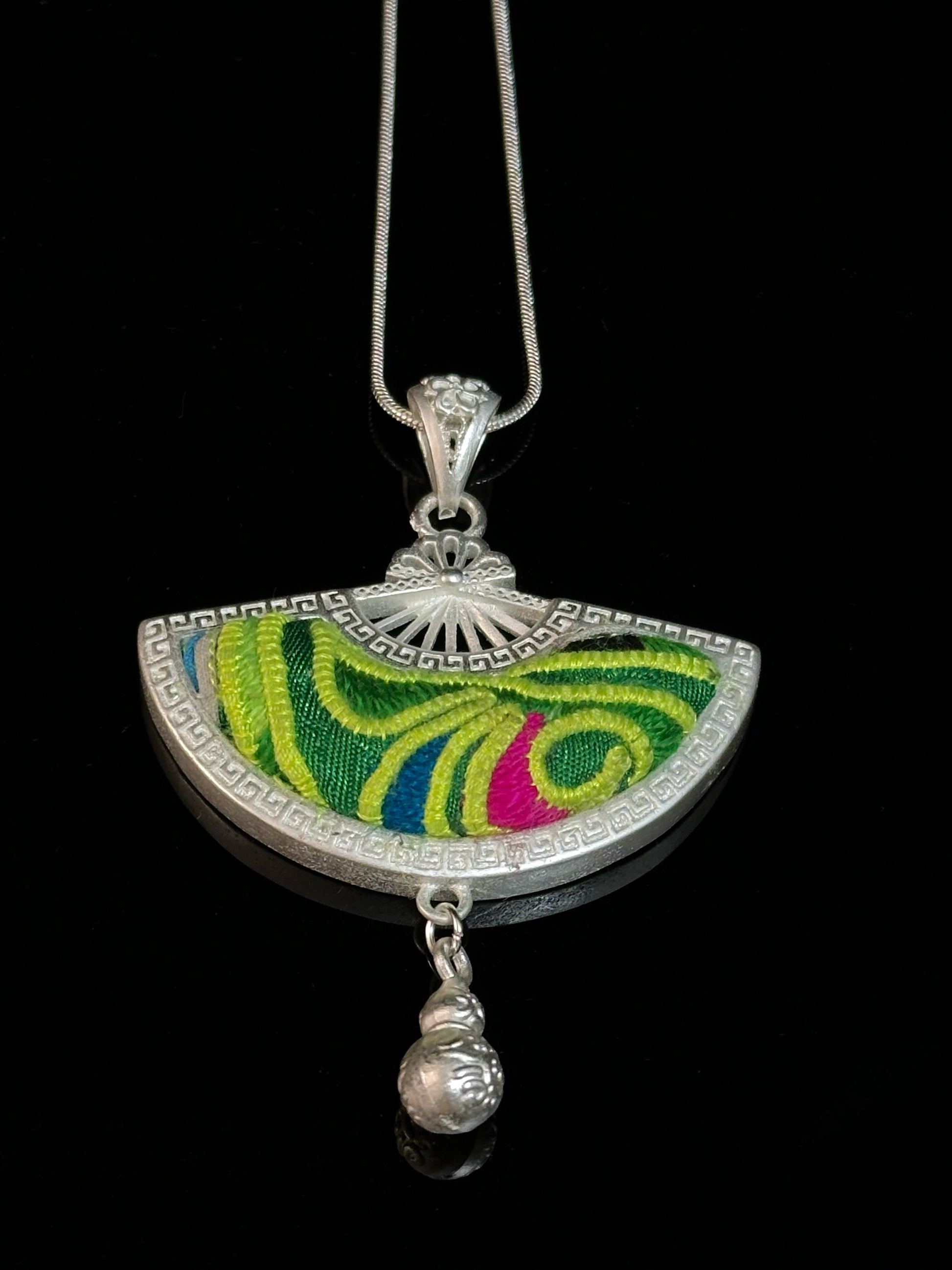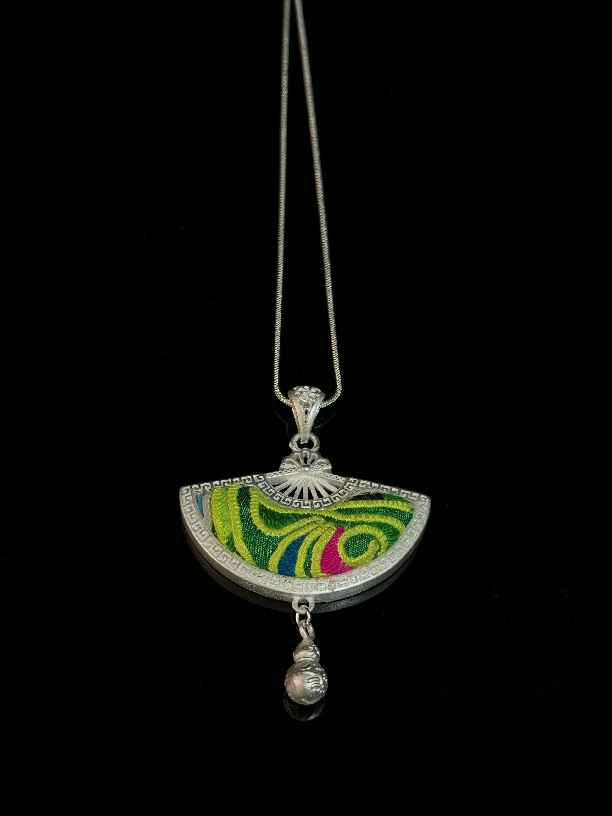 Verdantlight Echo is delicately embroidered by Miao craftswomen using vibrant green and lime silk threads. The flowing fan-shaped pendant is framed in polished silver, finished with a small engraved gourd charm that sways gently with movement. On the back, the silver surface is carved with traditional Miao blessings—symbols long associated with prosperity and good fortune.