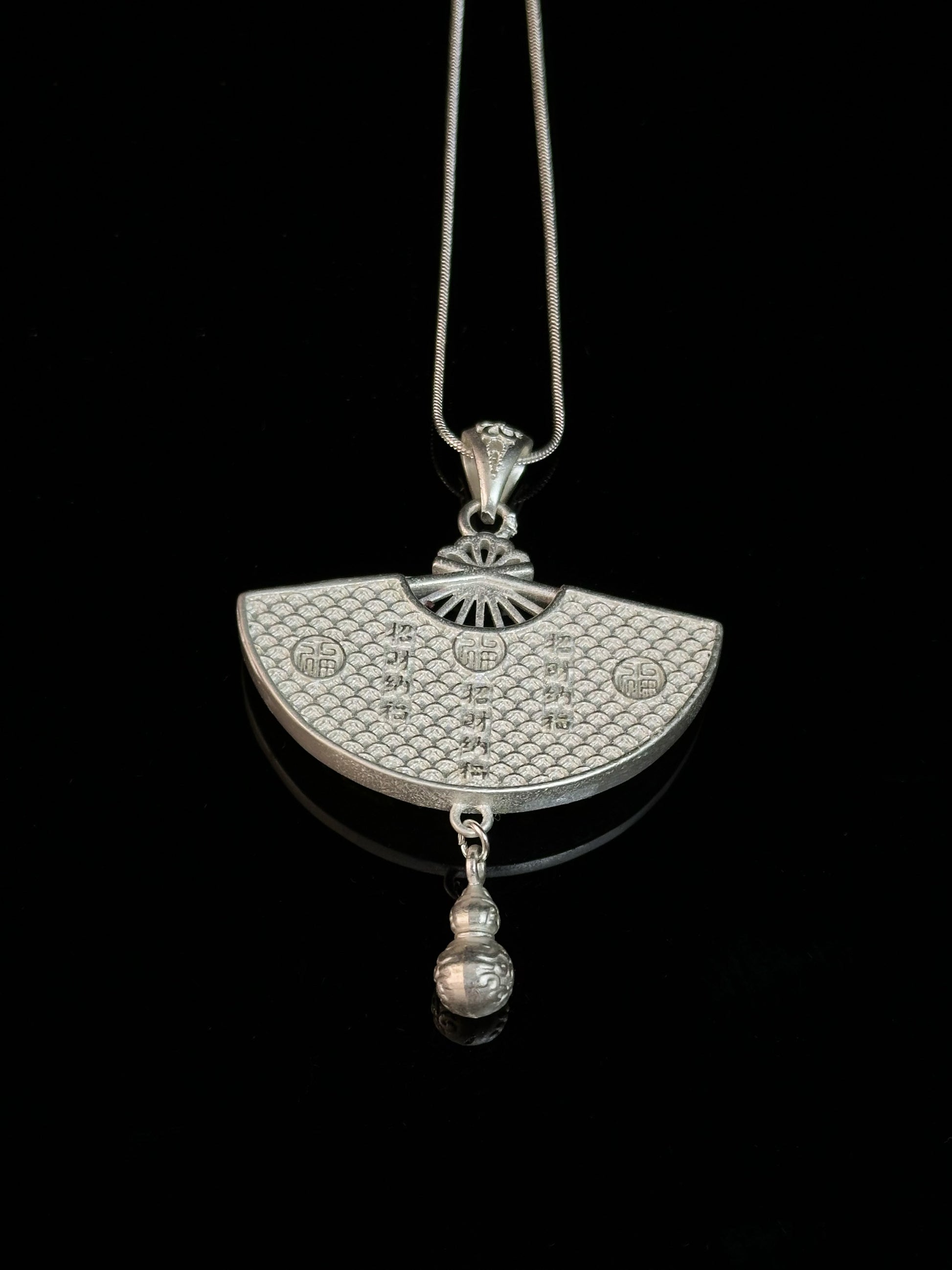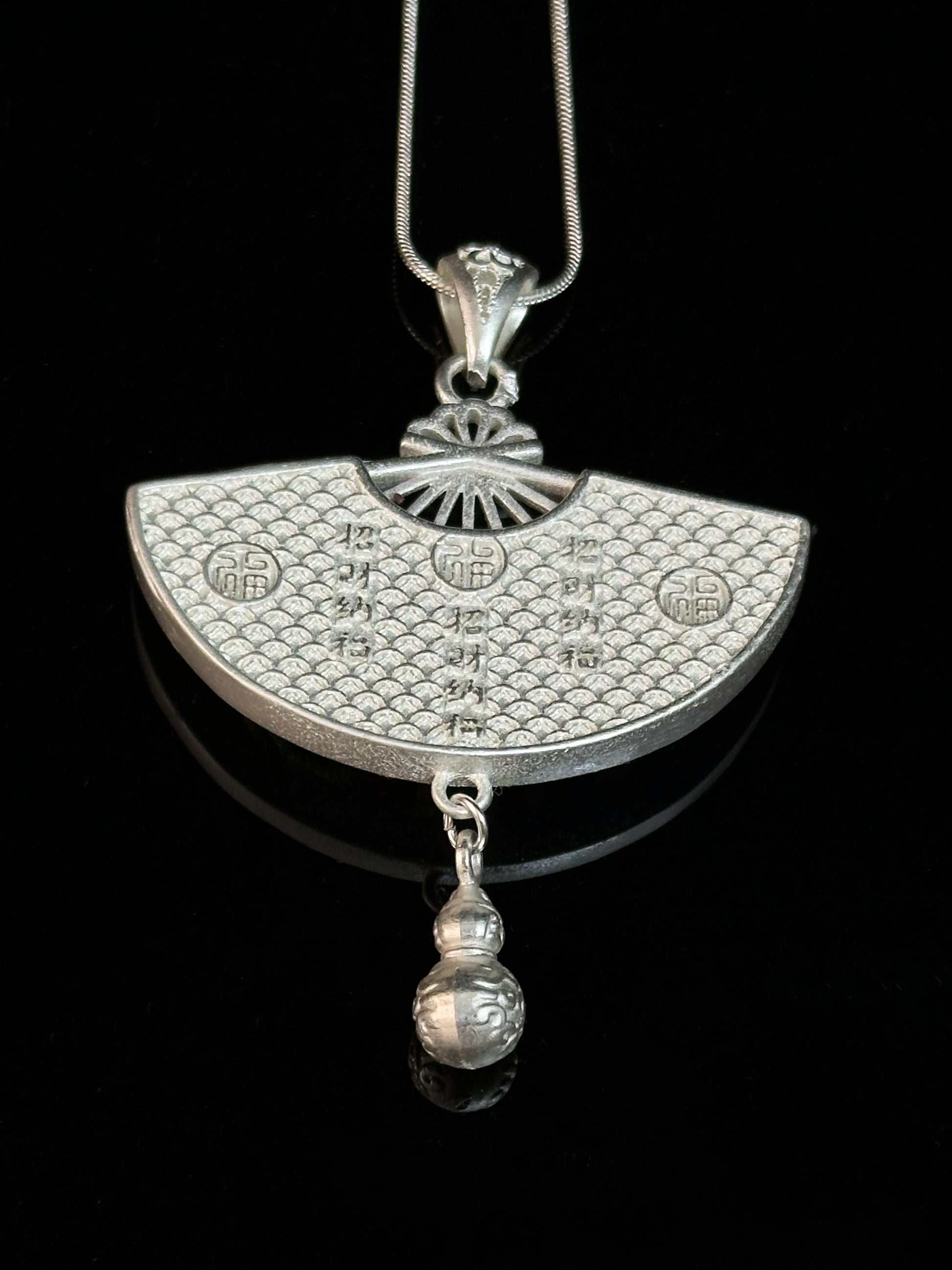 In Miao tradition, green tones symbolize growing life and renewal. The swirling patterns reflect mountain winds and flowing water—forces thought to carry wealth across generations. The gourd-shaped charm below is a classic emblem of luck and fertility. When paired with the inscribed blessings on the reverse, Verdantlight Echo becomes a quiet guardian of fortune.