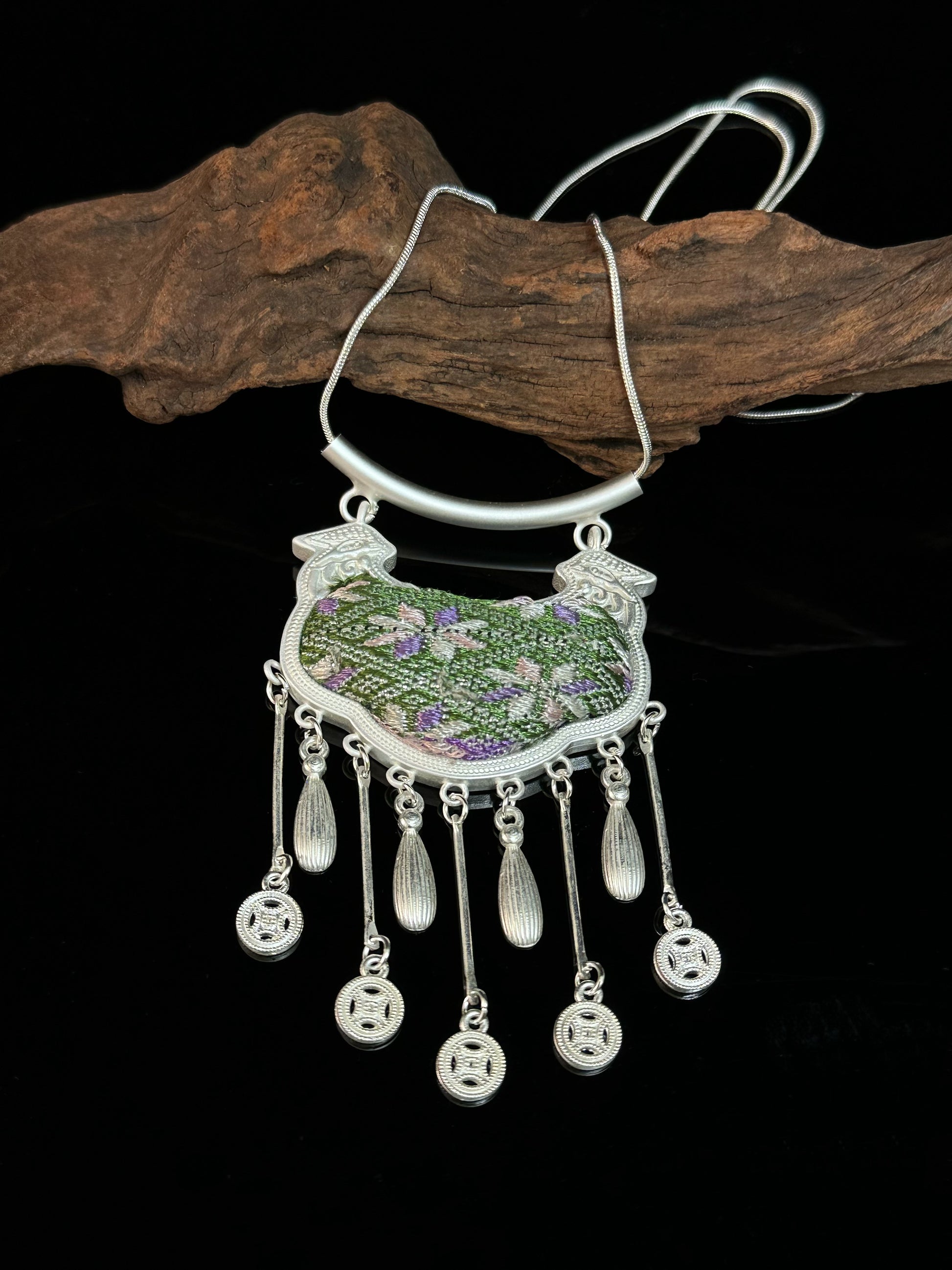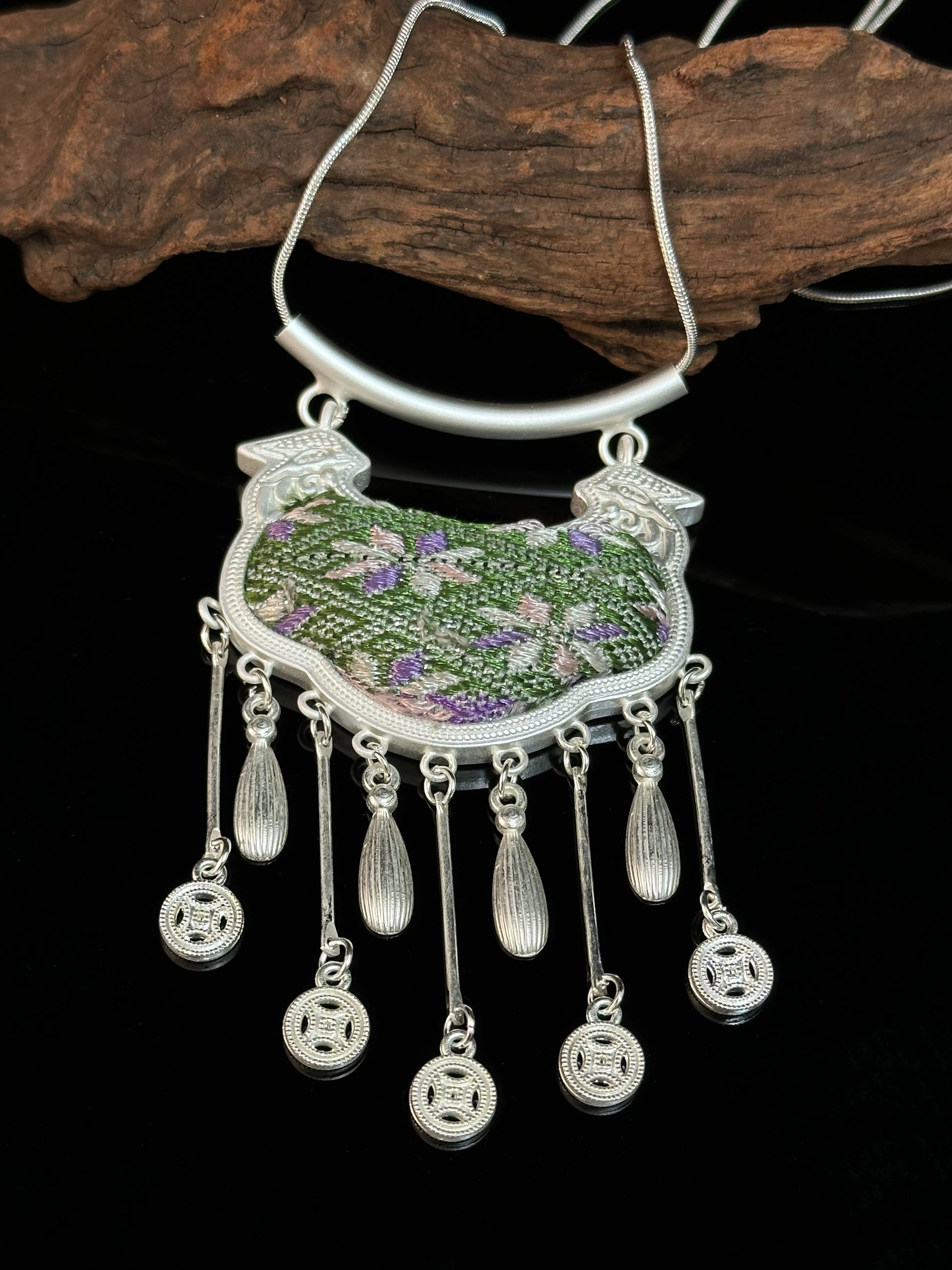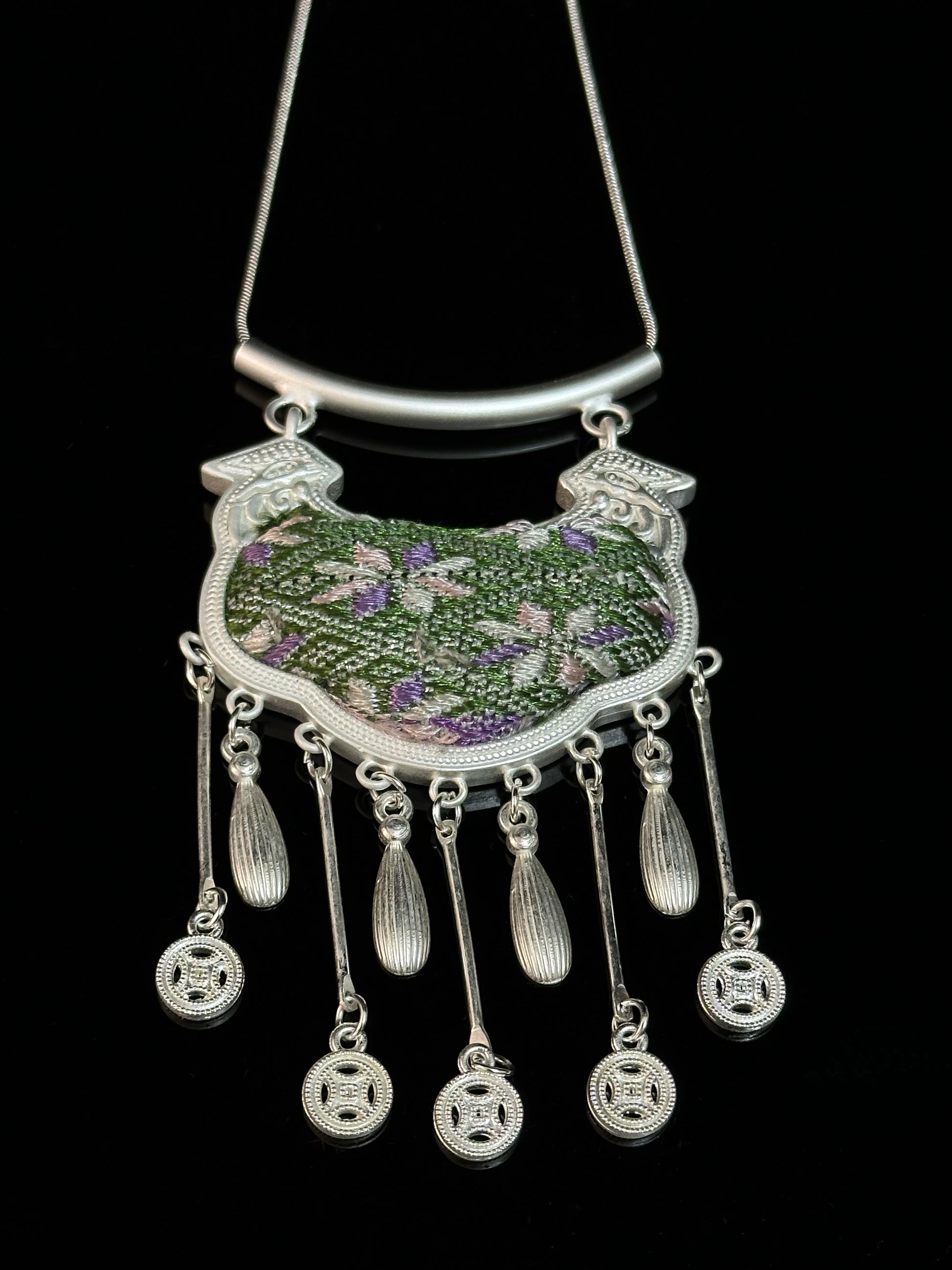 Shimmering with threads of pale violet and moss green, this pendant echoes the hush of blooming groves in spring. Every stitch is laid by hand on fine silk, framed in silver with gentle curves that cradle the embroidery. From its base hang delicate charms that sway with movement, light as leaves in a breeze. Turn it over to discover an engraved pair of birds among flowers—an ancient Miao motif evoking harmony, renewal, and shared fortune.