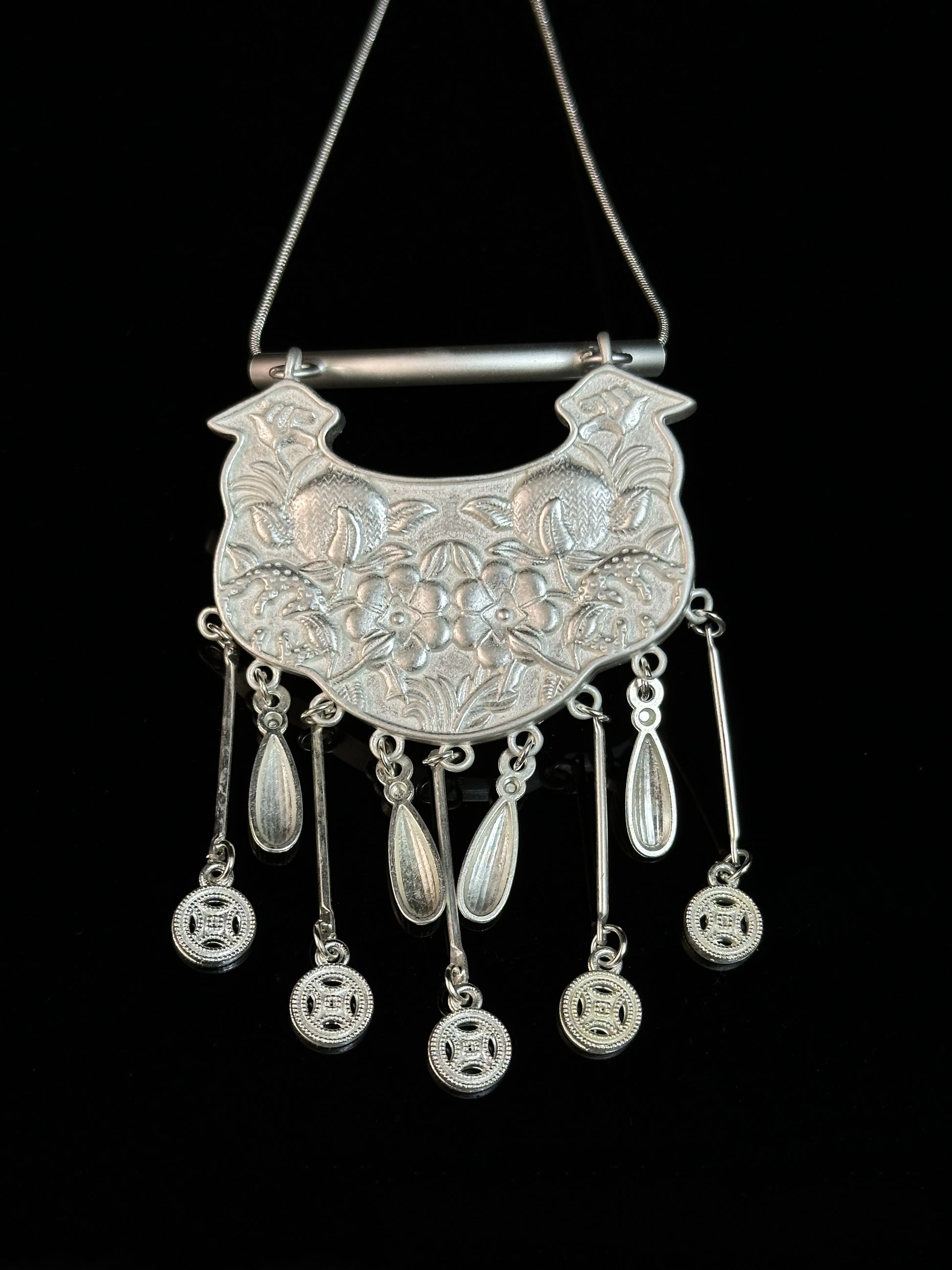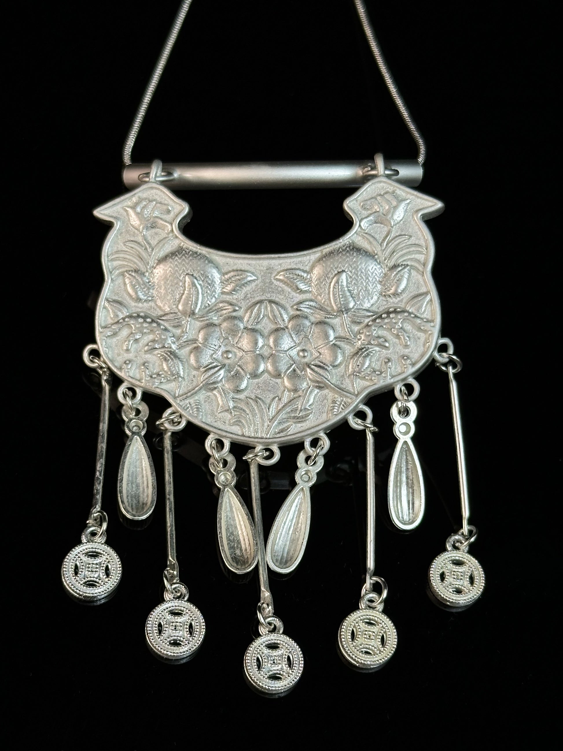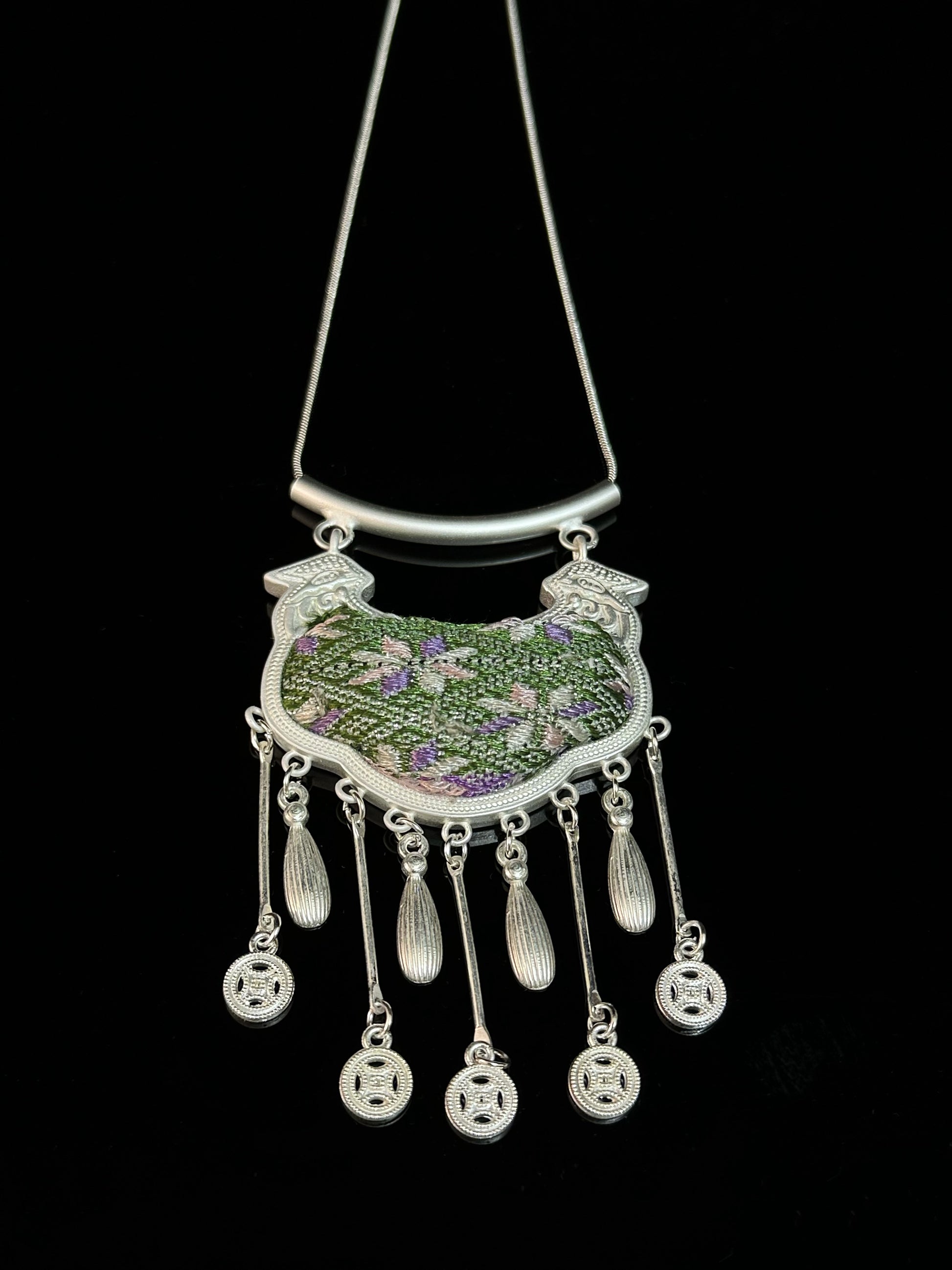 Shimmering with threads of pale violet and moss green, this pendant echoes the hush of blooming groves in spring. Every stitch is laid by hand on fine silk, framed in silver with gentle curves that cradle the embroidery. From its base hang delicate charms that sway with movement, light as leaves in a breeze. Turn it over to discover an engraved pair of birds among flowers—an ancient Miao motif evoking harmony, renewal, and shared fortune.